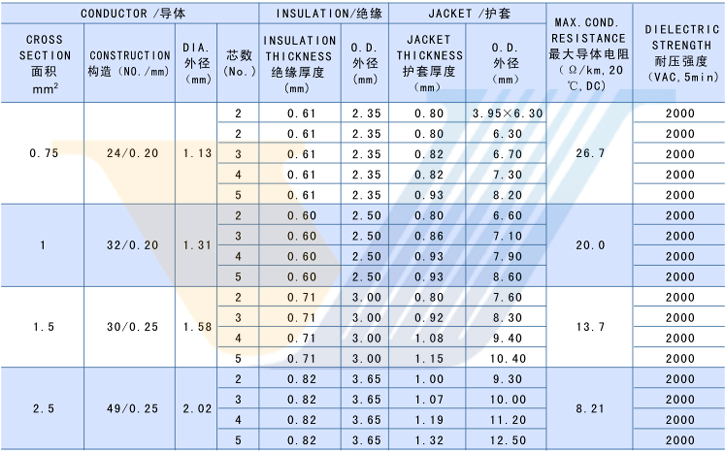 導(dǎo)體使用絞合:0.75-2.5mm 裸銅或鍍錫